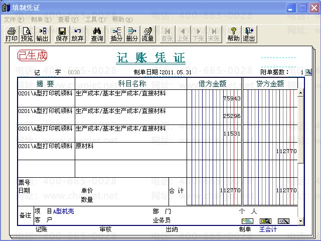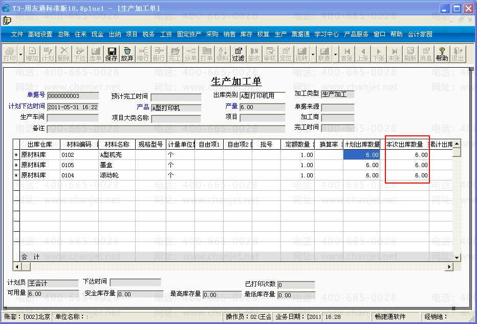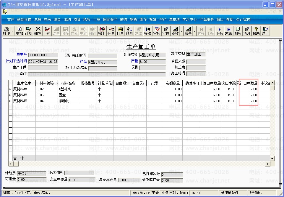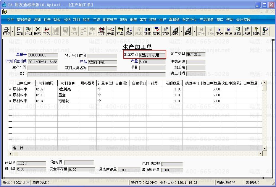1、点击“生产管理”-“生产加工单”,填制一张加工A型打印机的生产加工单,出库类别选择“A型打印机用”;