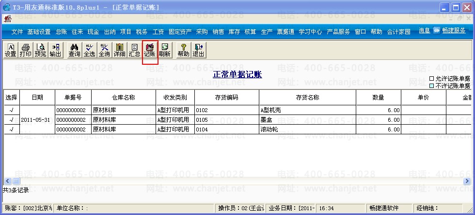 5、进入核算管理,点击“正常单据记账”,全选后点击“记账”;