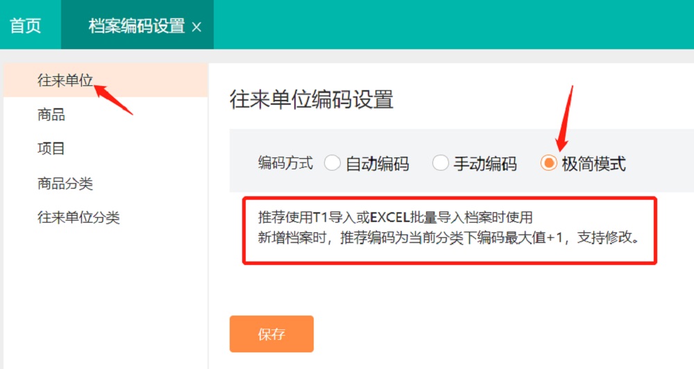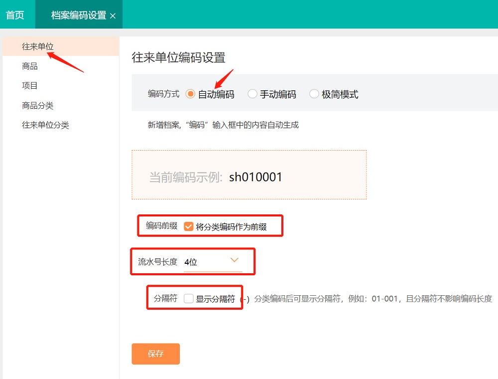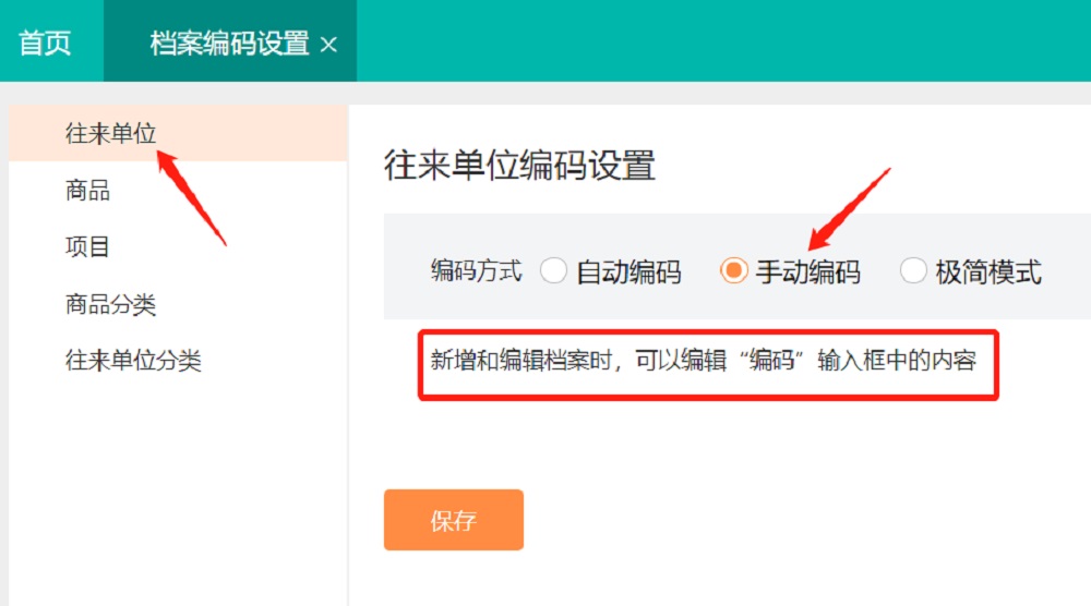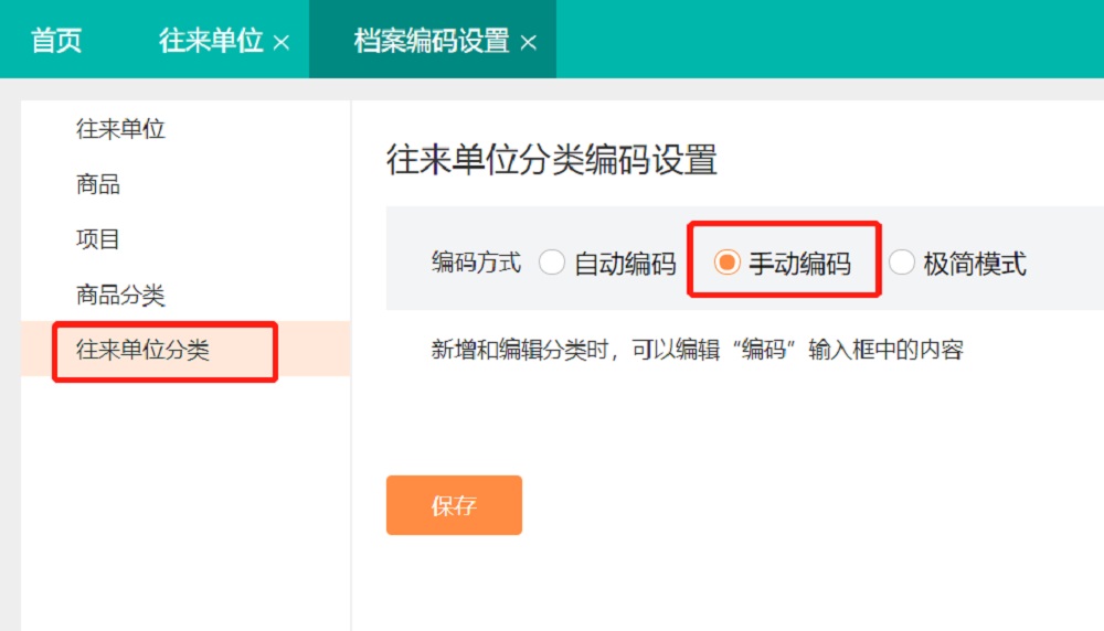 ①单位编码:目前有3种方式,分别是自动编码、手动编码和极简模式。(注:自动编码方式下,删除的往来单位编码也会占用编码)