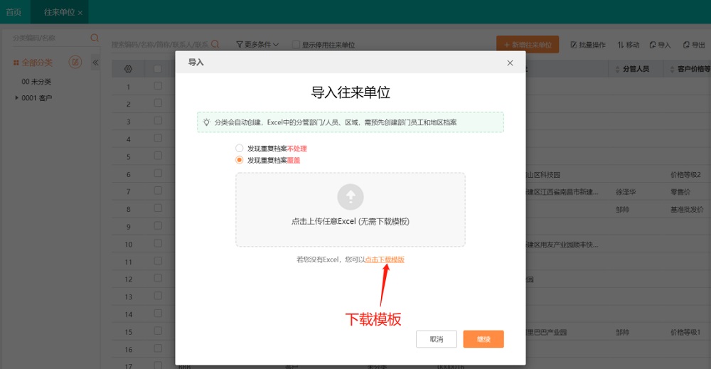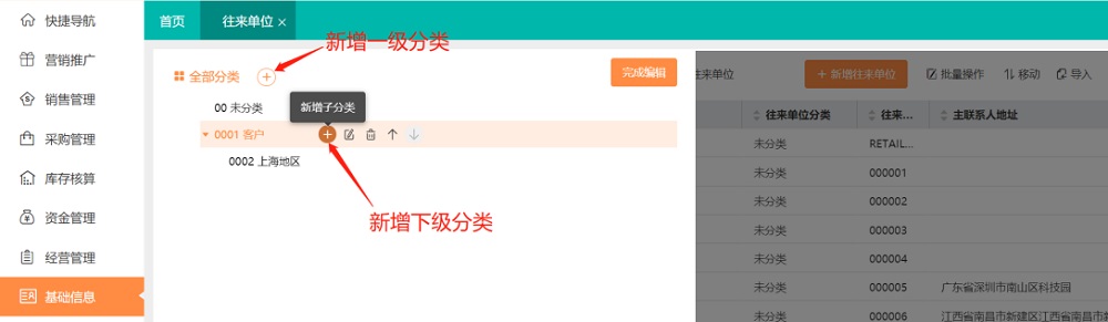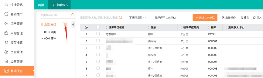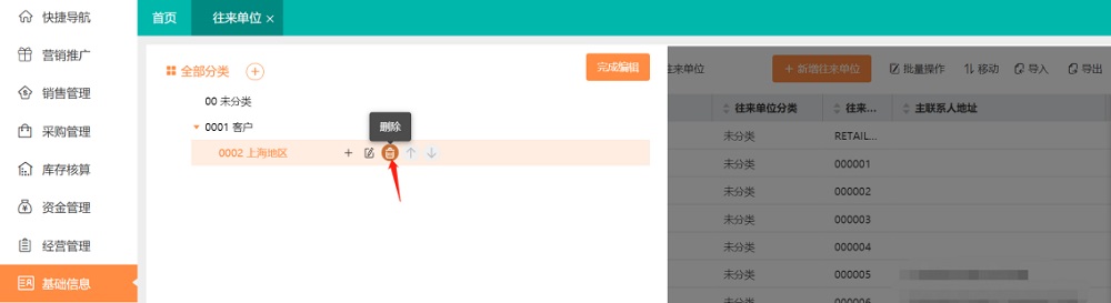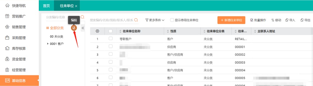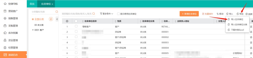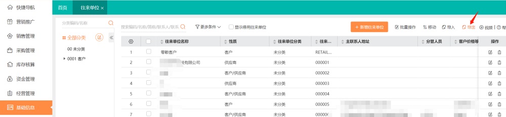 (8)往来单位批量导出:点击【基础信息】-【往来单位】-【导出】