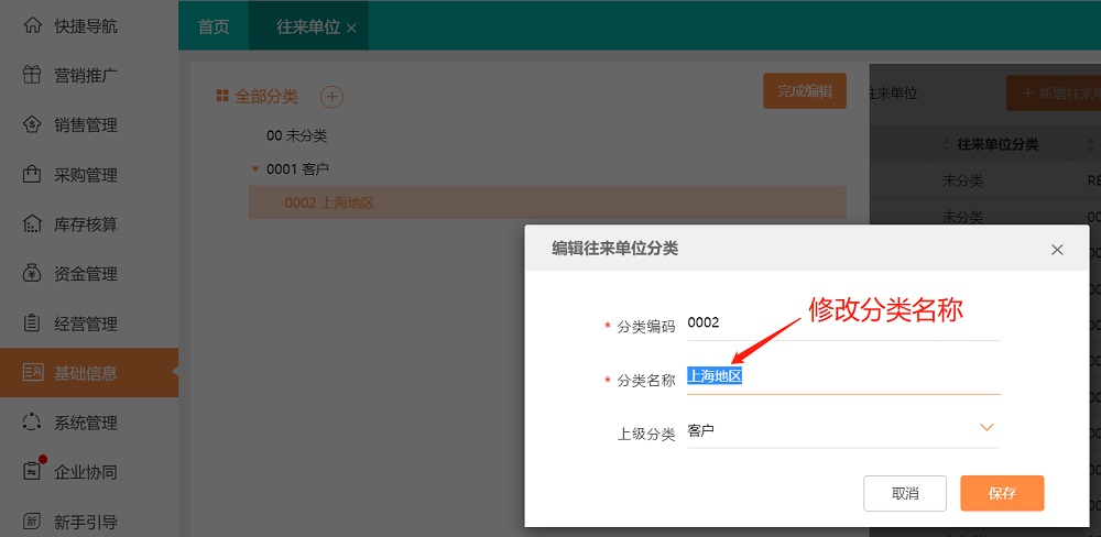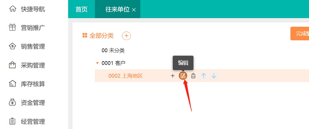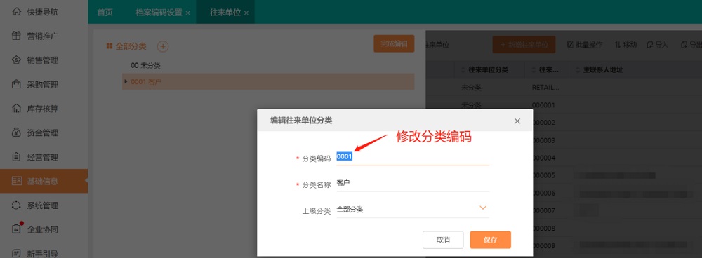 系统默认的分类编码规则为自动编码,自动编码规则下是不能修改分类编码的,需要把往来单位分类编码设置为【手动编码】,刷新页面之后,才可以修改往来单位分类编码;