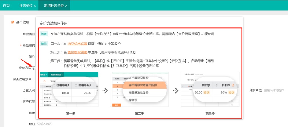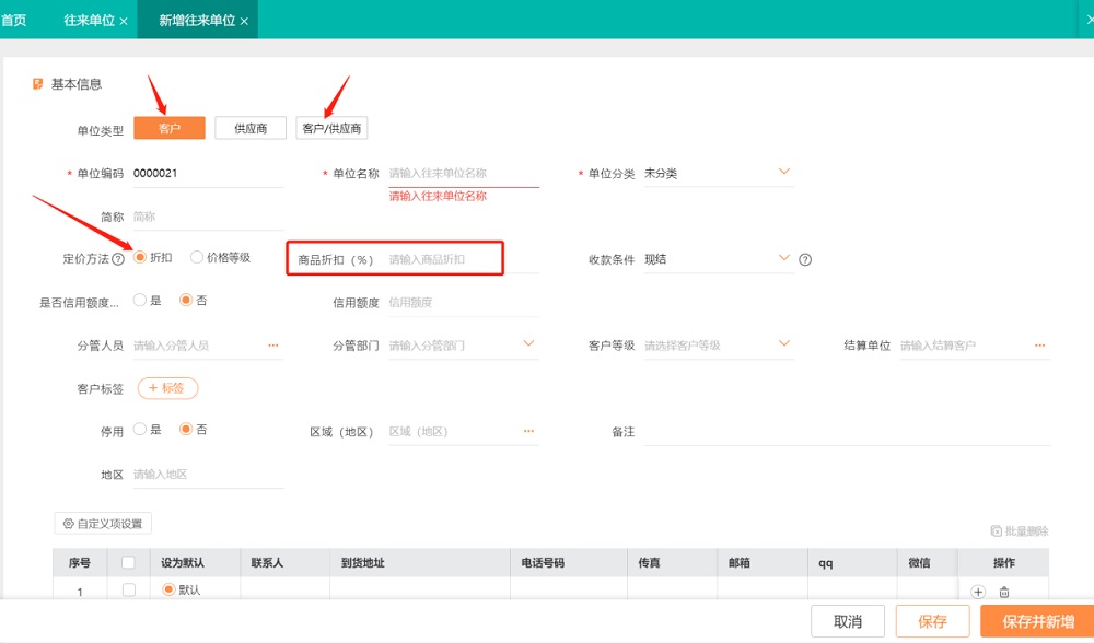 第一步、新增往来单位,单位类型选择【客户】或【客户/供应商】,定价方法选择【折扣】,并录入相应的【商品折扣】;