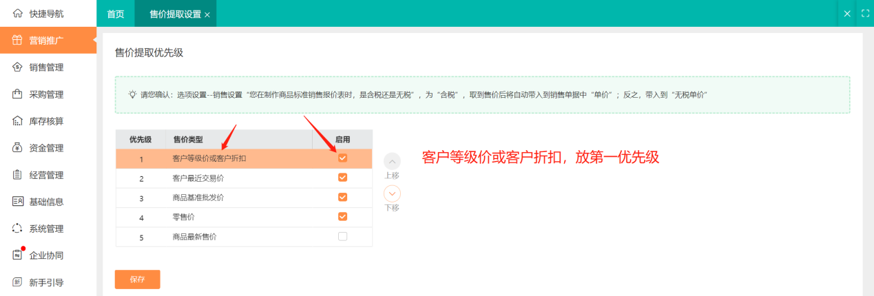 第二步、在【售价提取设置】中优先选择【客户等级价或客户折扣】