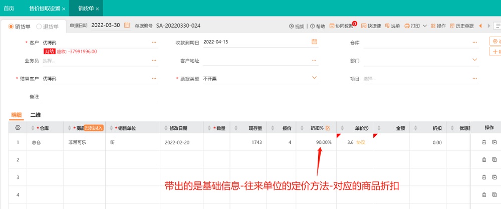 折扣:商品定价时可以为不同客户设定不同的商品折扣,在销售开单时,根据【定价方法】自动带出对应的商品折扣率,需要配合【售价提取策略】功能使用。具体操作如下:
