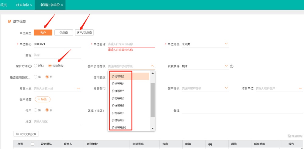 价格等级:商品定价时可以为不同客户设置10级等级价格,客户的定价方式选择价格等级时,可以为当前客户设置所对应的商品价格等级。