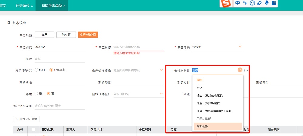 (4)收付款条件:现结、月结、订金+发货前收款、订金+发货后尾款、订金+发货前中期款+尾款、不固定账期、限期收款