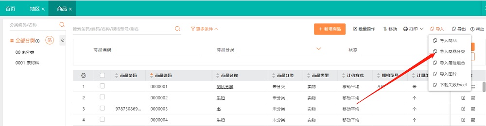 在初始使用时,支持维护商品分类信息,也支持通过excel方式导入商品分类