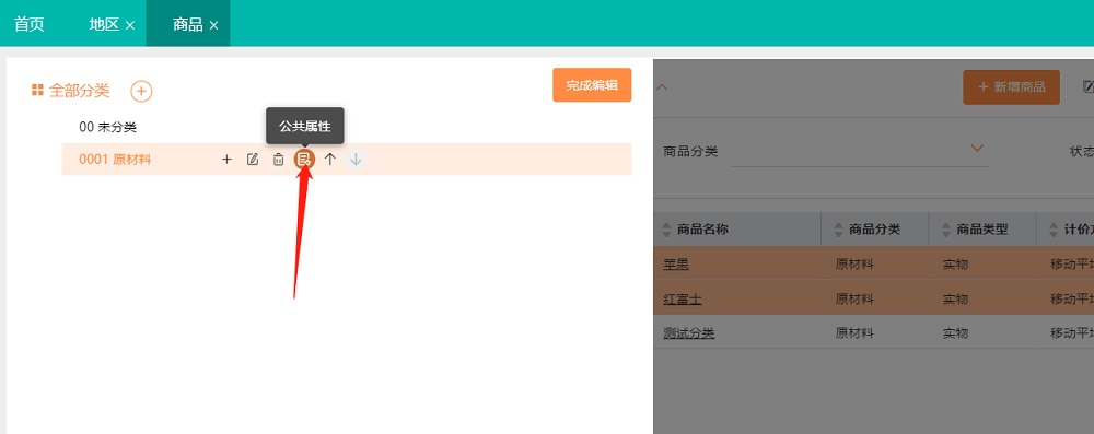 ③商品分类公共属性,设定后,该分类下新增商品会默认带出,不会影响已经存在的商品,例如有些商品属性,在父一级分类和子一级分类中,该属性值都是相同的。(例如:【商品产地】这个字段,如果父级是广东,子一级商品的该字段也都是广东,为了便捷可以在父级分类节点上,统一维护这个字段的属性值,那么在新增该父类下的商品信息时,该字段默认值为广东,减少录入的麻烦。)