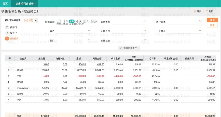 按部门来汇总统计,各个部门在某段时间里销售的主数量、金额、无税金额、成本金额、毛利、现金折扣金额、销售费用、净利润、净利率。支持按净利润、或毛利或销售金额来排序,这样分析出销售表现较好的部门。