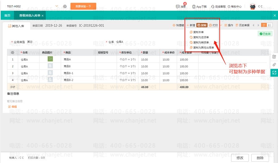 1、赠品入库的商品直接转为销售。通过工具栏【复制/复制为销货单】功能,将单据信息复制为一张销货单。