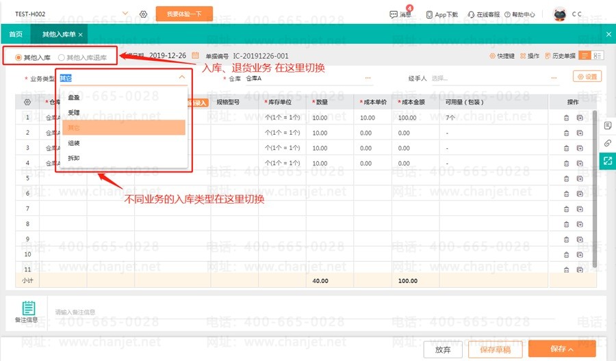 无论是受赠,还是其他类型的业务,由于入库商品质量等原因,需要退回,这时可通过单据类型进行切换。