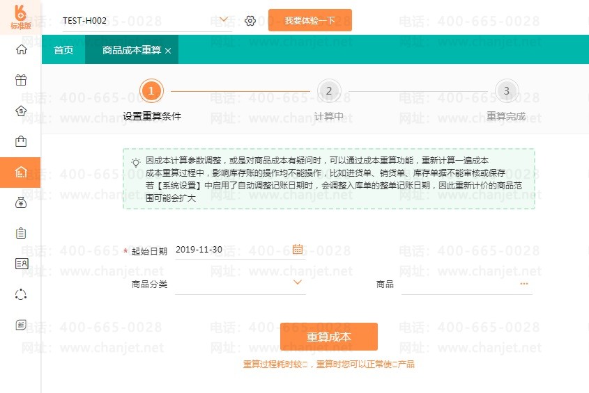 3、如果系统选择按“仓库+商品”核算,则还可以重新计算整个仓库的成本。