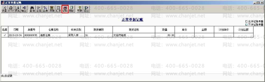 3、进入“核算管理”模块,点击“正常单据记账”,勾选“地板仓库”一“确定”,进入“正常单据记账”,勾选“单据号”一点击“记账”。