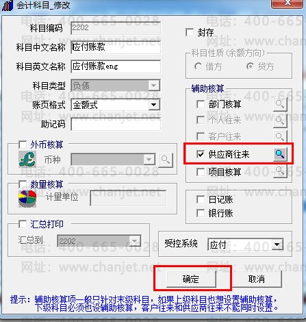 1. 对供应商往来挂辅助核算:依次点击“基础设置”-“财务”-“会计科目”菜单,双击打开“2202应付账款”科目,勾选“供应商往来”辅助核算: