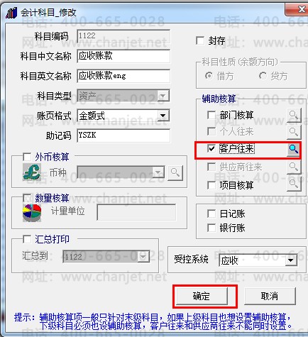 双击打开“1122应收账款”科目,勾选“客户往来”辅助核算: