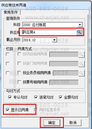 查询供应商往来两清记录:点击”供应商往来两清”按钮,科目选择“2202应付账款”,供应商选择“供应商A”和勾选显示已两清后点击确定: