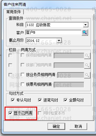查询客户往来两清记录:点击”客户往来两清”按钮,科目选择“1122应收账款”,客户选择“客户B”和勾选显示已两清后点击确定: