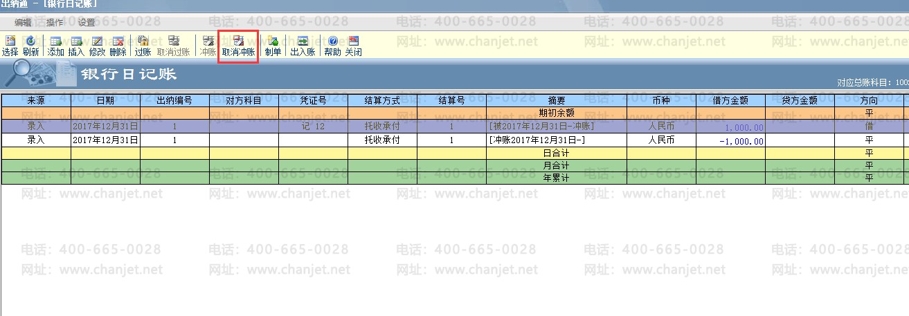已冲账的日记账,在选中该条日记账后,菜单栏上“冲账”的按键置灰,“取消冲账”可以点击,取消冲账后删除该日记账;