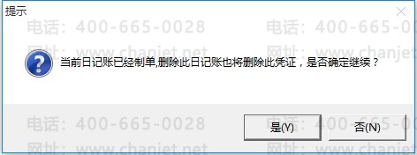 另外:如果该日记账已制单,则删除时提示“当前日记账已制单,删除此日记账也将删除此凭证,是否确定继续?,点击“是”则即删除日记账也删除凭证。