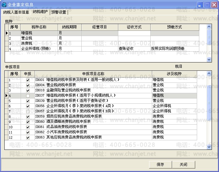 点击【营业税申报】图标后,系统根据【企业鉴定信息】中鉴定的申报项目来显示不同的报表。