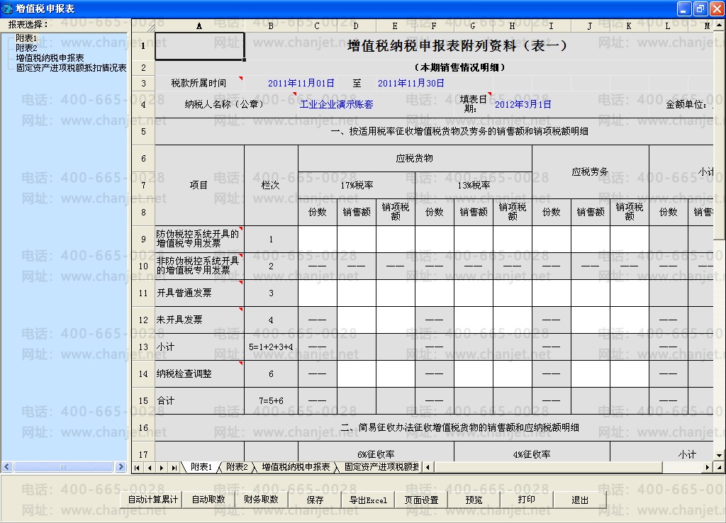 点击【增值税申报】图标后,系统根据【企业鉴定信息】中鉴定的申报项目来显示不同的报表。
