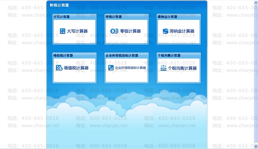 点击“财税计算器”进入财税计算器工具界面:增值税计算器、企业所得税指标计算器、个税均衡计算器、大写计算器、找零计算器、滞纳金计算器。