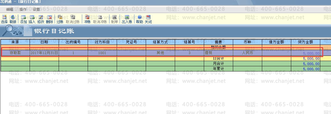 (5)查看对应的银行账户的日记账,自动生成一条对应的存取款业务,显示银行存款贷方 5000 元;