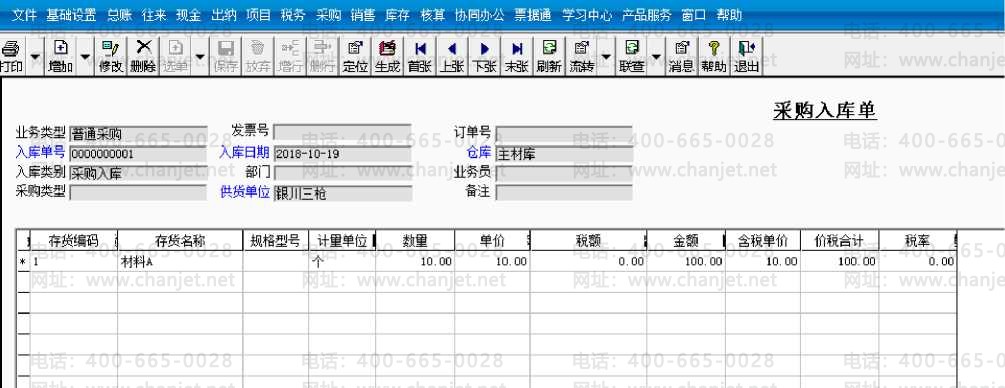 例:10月19日采购10个材料A,当天验收入库;