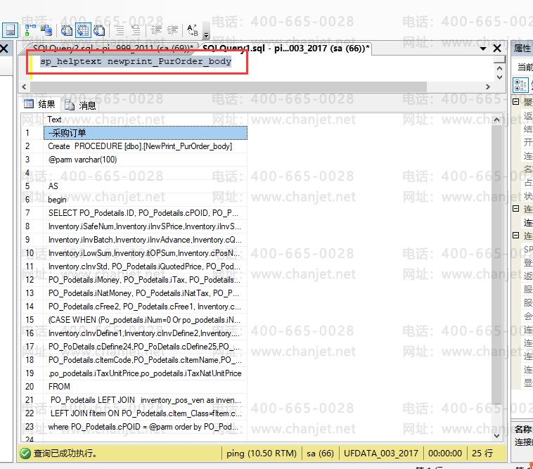 2. 进入查询分析器执行查看存储过程的命令:sp_helptext newprint_PurOrder_body