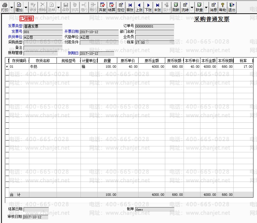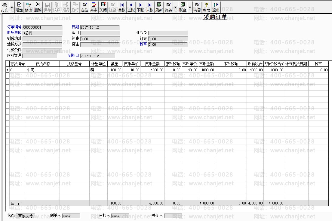 2. 新增采购订单,供应商-A公司,数量100箱,金额4000元,审核采购订单。