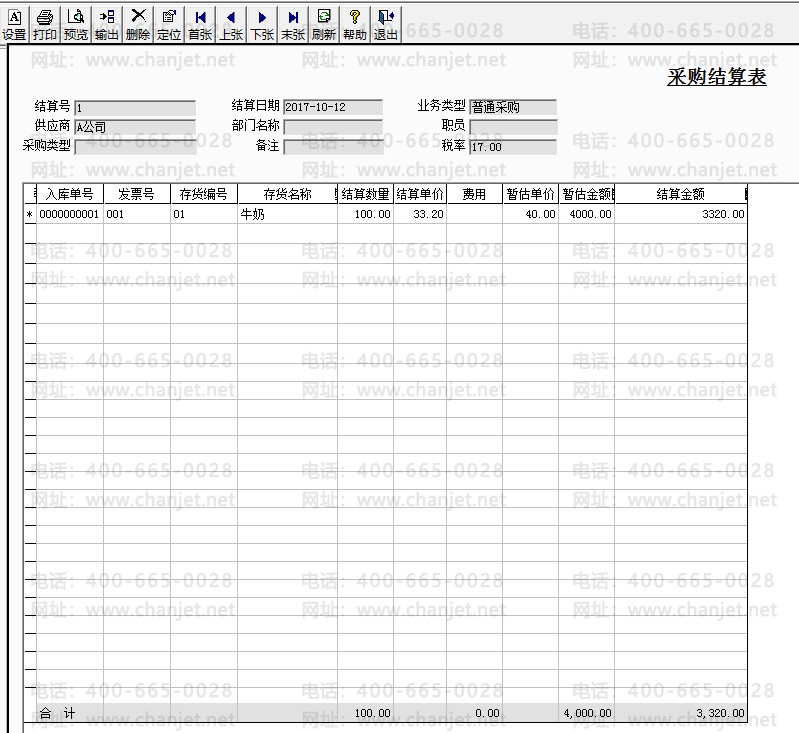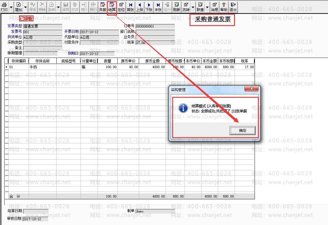 4.将采购入库单和采购发票做采购结算,点击采购发票表头的【结算】按钮