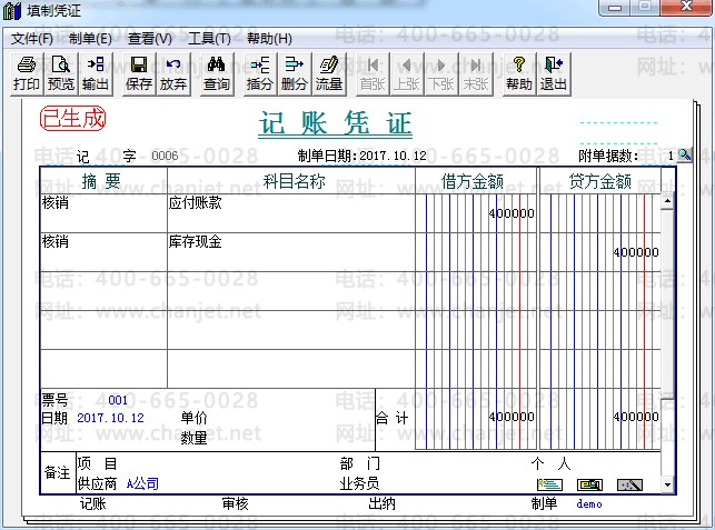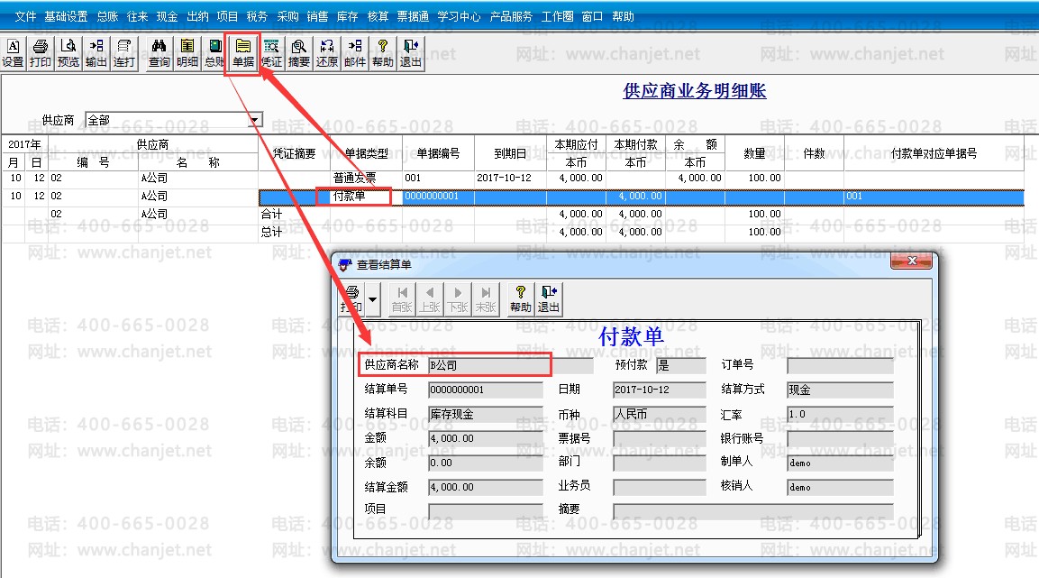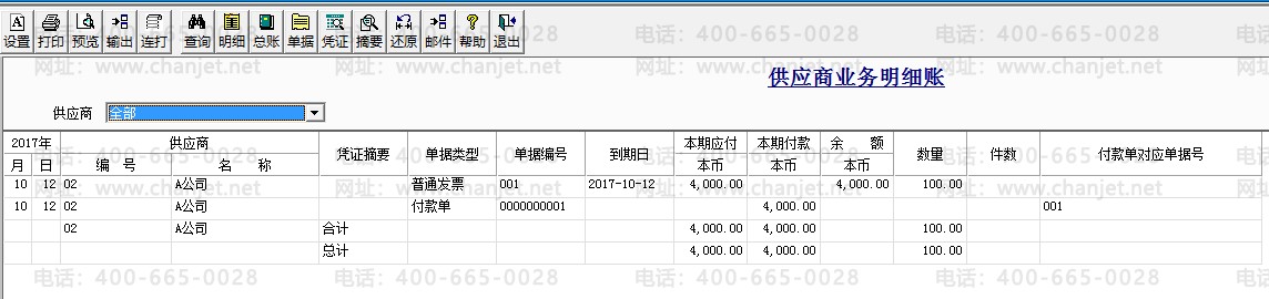 6.查看供应商往来明细账,供应商A公司的应付余额为0