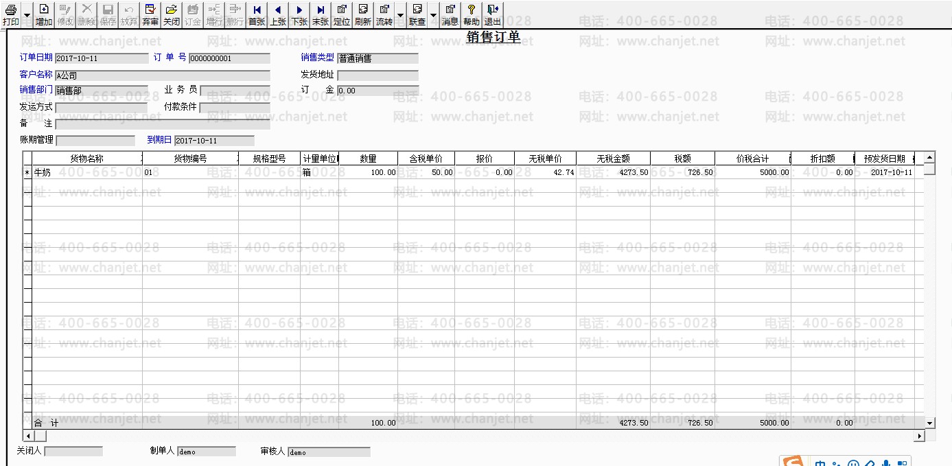 8.新增销售订单,客户-A公司,数量100箱,金额5000元,审核销售订单。