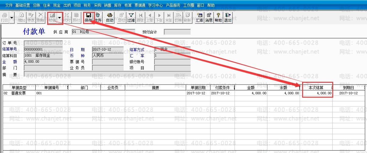 5. 点击付款结算,供应商B公司,金额4000元,点击【代付】-【供应商】选择A公司-【金额】填制4000元,点击【核销】,核销A公司的采购发票-【结算金额】4000元。