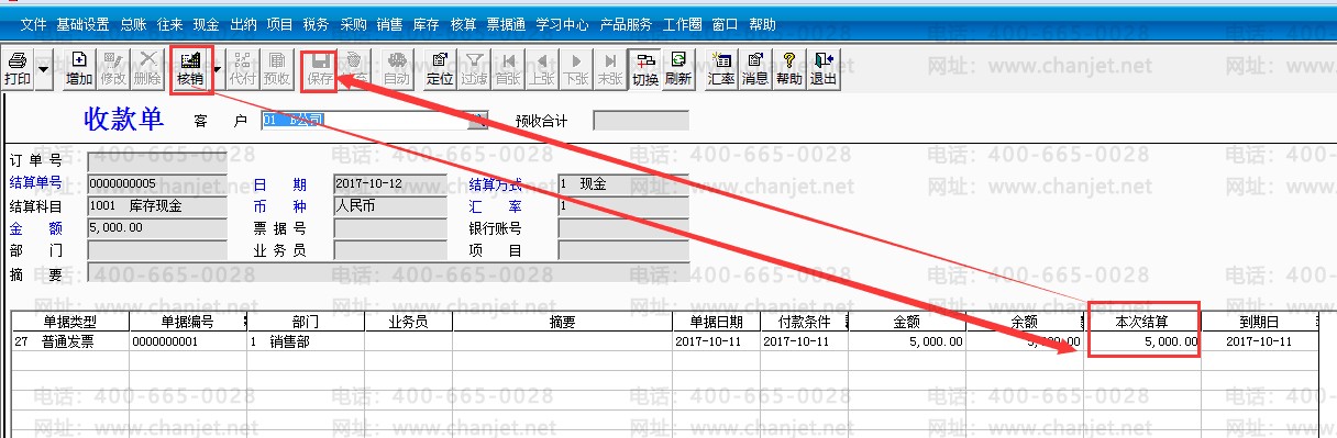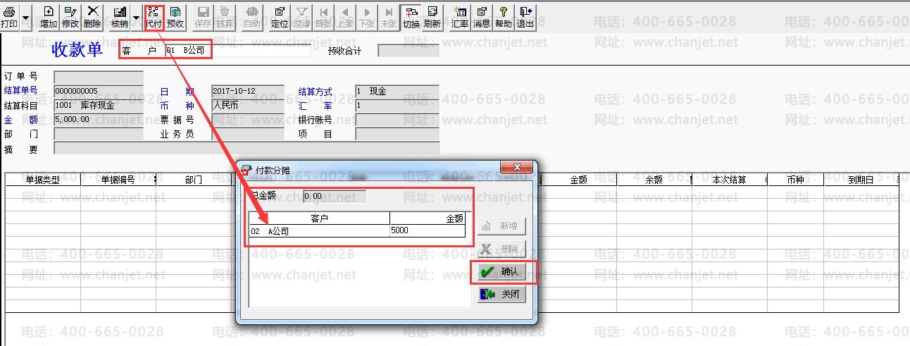 10.点击收款结算,客户B公司,金额5000元,点击【代付】-【客户】选择A公司-【金额】填制5000元,点击【核销】,核销A公司的销售发票-【结算金额】5000元