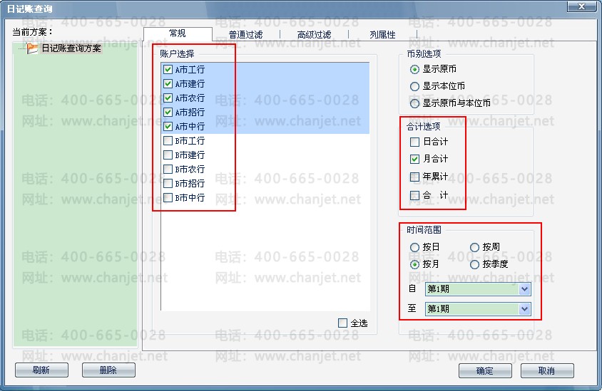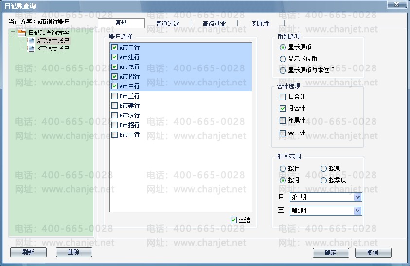 2、“账户选择”勾选所有A市账户-“合计选项”按照需求勾选-“时间范围”按照需求勾选-确定