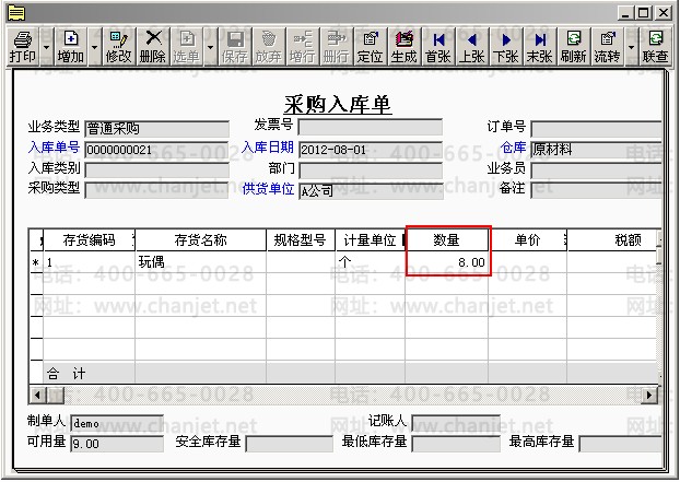(2)货物入库,发现实际录入8个,损耗的2个经核实确认为合理损耗。