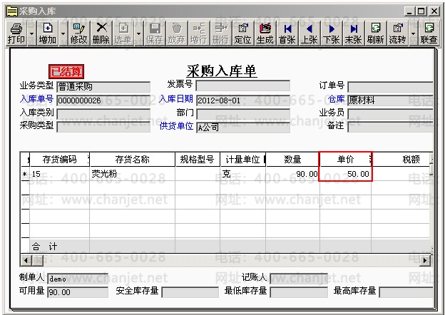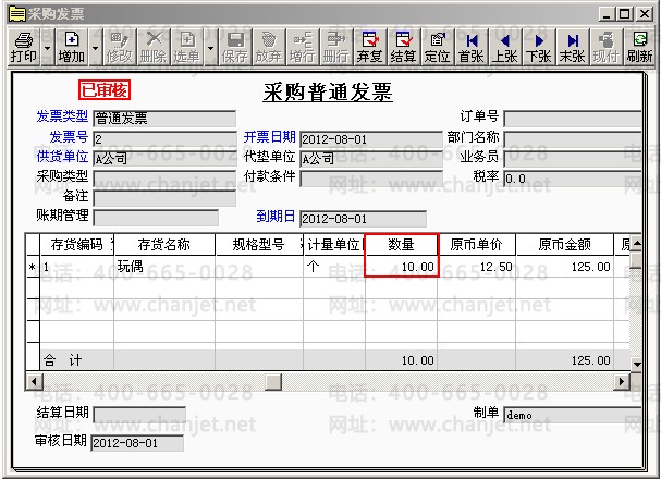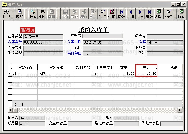 (4)因为相差的2个存货确认为合理损耗,系统会把10个存货的采购成本(发票金额)分摊到8个中。结算后,采购入库单上的单价提高。