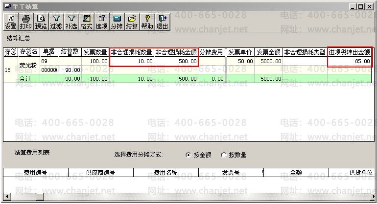 (3)采购发票与采购入库单结算,在“非合理损耗数量”中输入10,输入非合理损耗的金额500,自动带出进项税额转出金额。