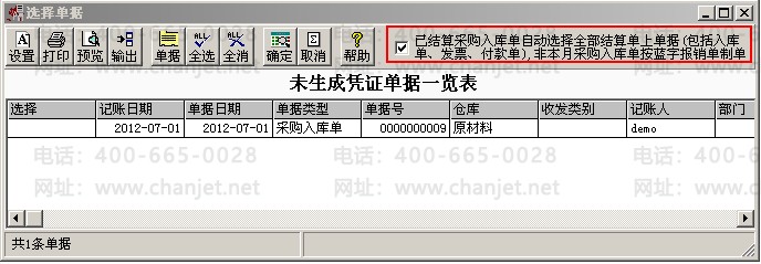 (6)采购入库单正常单据记账后,在购销单据制单中,选择采购入库单(报销记账)制单,选择“已结算采购入库单自动选择全部结算单上单据(包括入库单、发票、付款单),非本月采购入库单按蓝字报销单制单”选项。