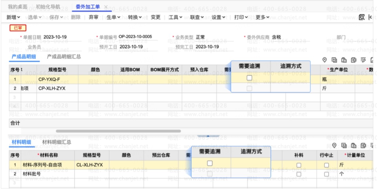 委外加工业务需要进行质量追溯,追溯内容包括产品的委外加工商、所有材料批次与供应商等内容