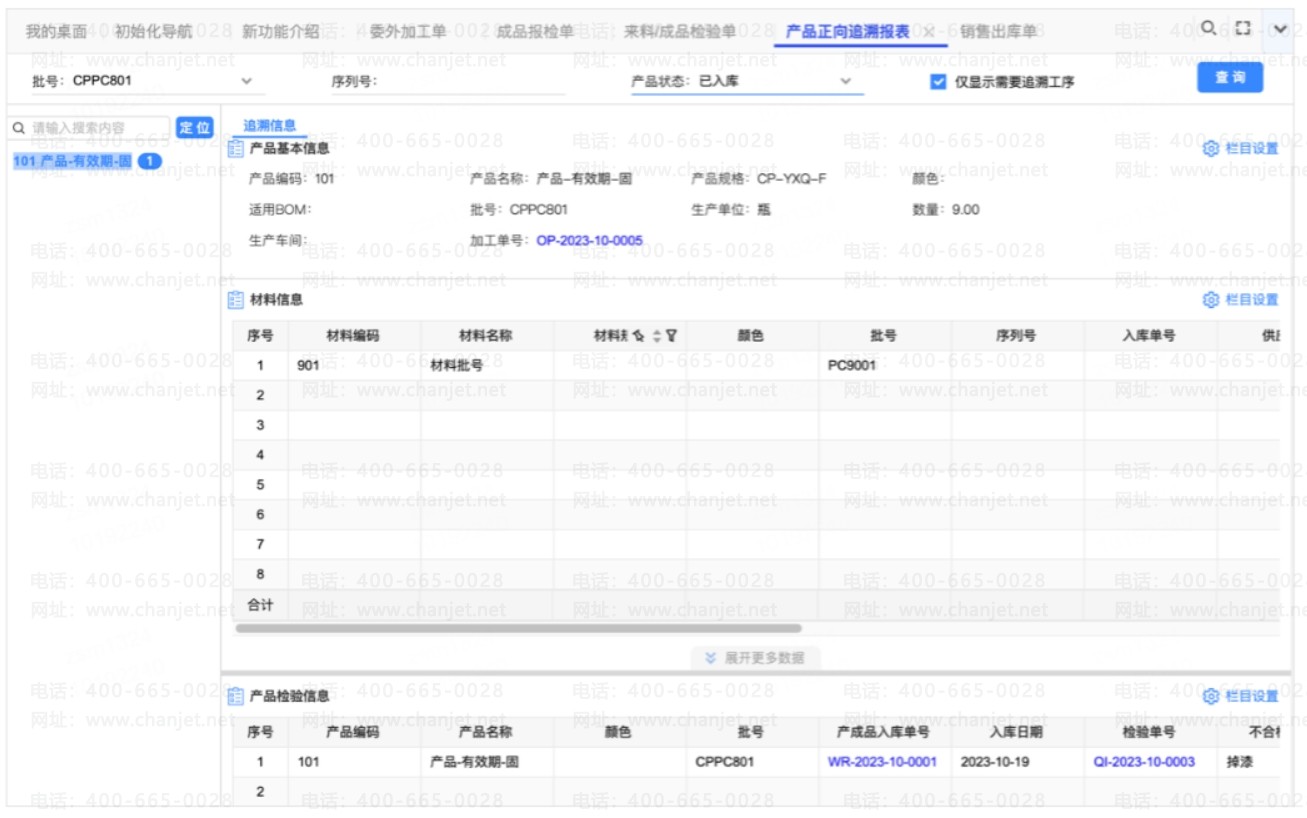 质量追溯报表支持查询委外加工的产品、材料、检验单、委外入库单、销售出库信息、库存信息