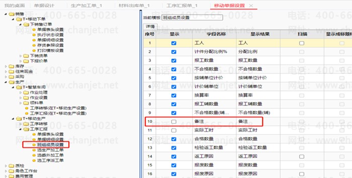 在T+软件的【系统管理】-【移动单据设置】,展开移动生产-工序汇报单,选择【班组成员设置】,将右侧的【备注】勾选显示保存设置,手机端下汇报单班组成员即可显示备注进行输入内容。