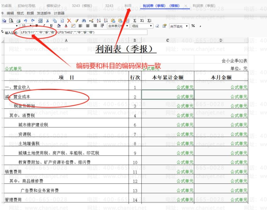 3、对照利润表对应科目编码,修改利润表公式上的科目编码