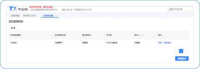 3、给需要的客户发送邀请,下发登录微信小程序(畅捷通TPlus)的密码,客户可以在线查看自己的单据。