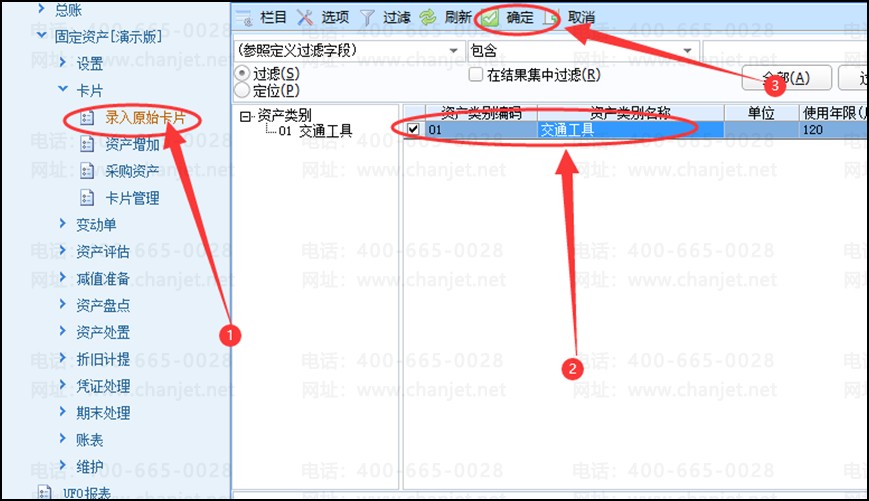 资产增加和原始卡片录入一样的操作,点开卡片---资产增加---选中资产类别---确定