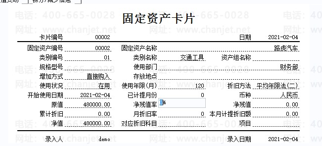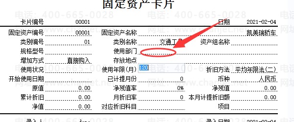 这里依次录入资产编号、名称、使用部门等信息,这个卡片录入的是系统启用之前,已经使用并且计提折旧的固定资产。