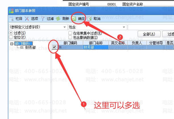 使用部门选择:点“使用部门”后面的地方,然后就出现一个“使用部门”