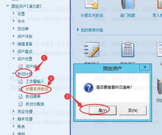 点开固定资产-折旧计提----计提本月折旧--------提示,点“是”