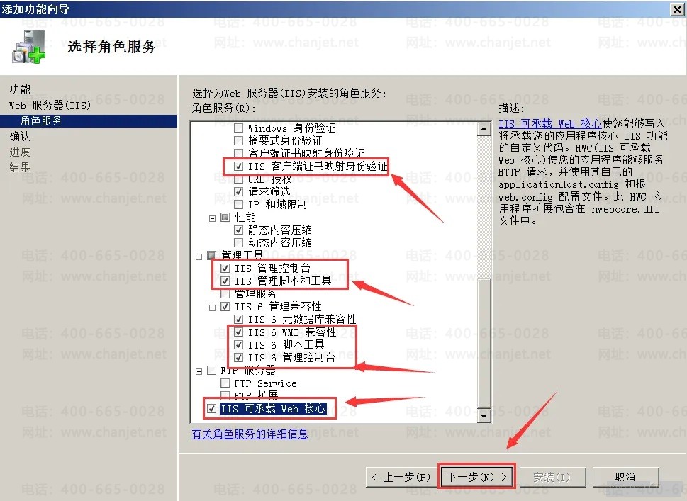 ①IIS客户端证书映射身份验证;②IIS管理控制台;③IIS管理脚本和工具;④IIS 6 WMI兼容性;⑤IIS 6脚本工具‘⑥iis 6管理控制台;⑦IIS可承载Web核心